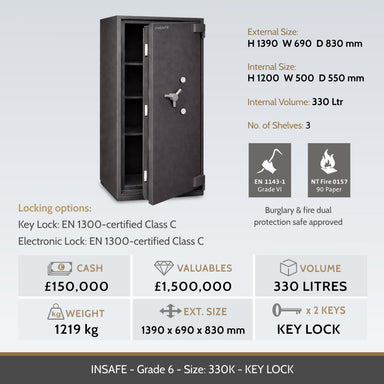 The Insafe 330K is a high-security safe ideal for protecting cash, valuables, and important documents. Certified to EN 1143-1 Eurograde 6 standards...